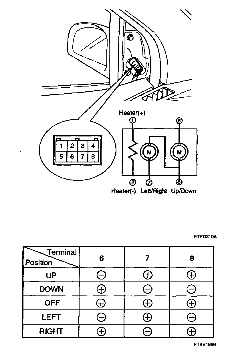 2. Apply battery voltage to each terminal as shown in the table and verify that the mirror operates properly.
