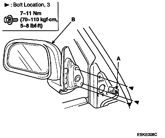 3. Disconnect the connector (A), then remove the mirror mounting bolts while supporting the mirror (B).