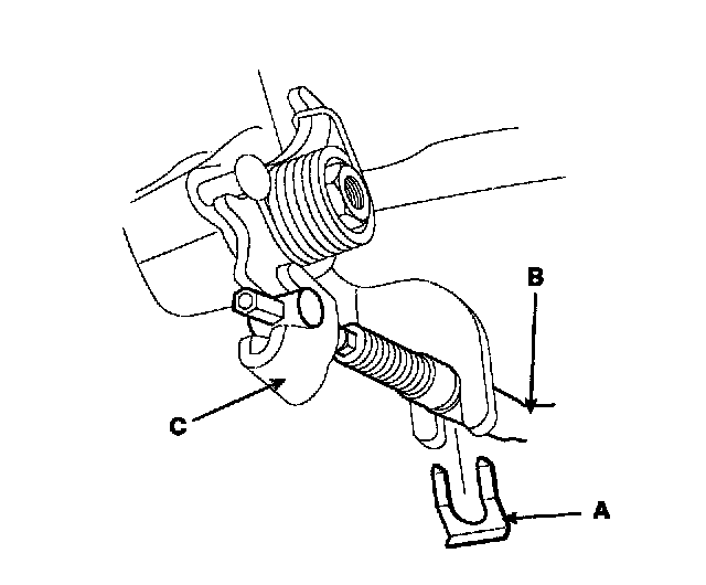 2. Disconnect the parking brake cable (B) from the lever (C).