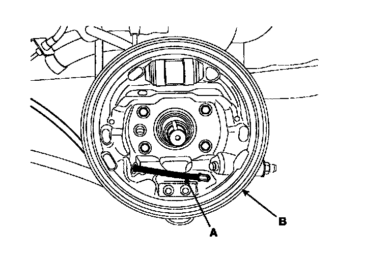 3. Remove the parking brake cable (A) from the backing plate (B).
