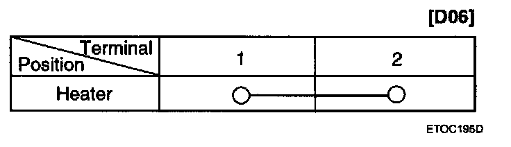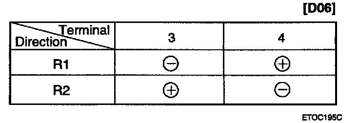 2. Apply battery voltage to each terminal as shown in the table and verify that the mirror operates properly.