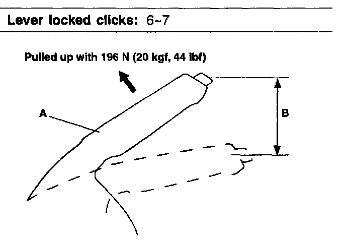 PARKING BRAKE CHECK AND ADJUSTMENT CHECK1. Pull the parking brake [ever (A) with 196 N (20 kgf, 44 lbs.) force to fully apply the parking brake. The parking brake lever should be locked within the specified number of clicks (B)