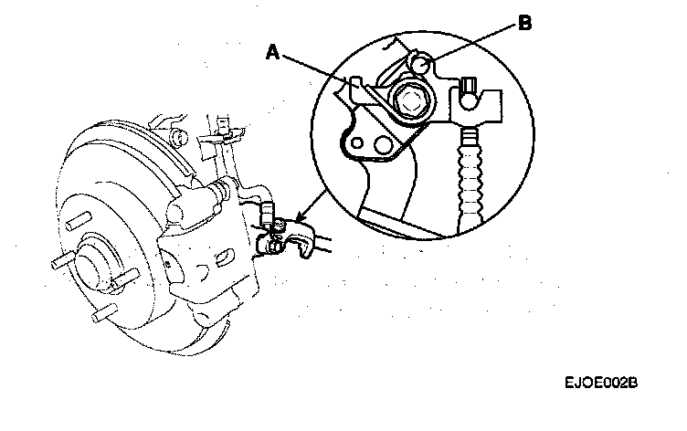 2. Make sure the parking brake arm (A) on the rear brake caliper contacts the brake caliper pin (B).