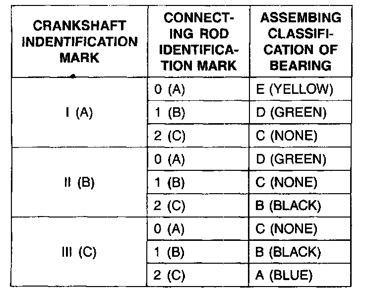 6) If the plastigage measures too wide or too narrow, remove the upper half of the bearing, install a new, complete bearing with the same color mark (select the color as shown in the next column), and recheck the clearance.