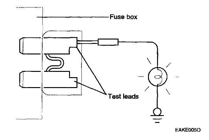 A blade type fuse test leads provided to allow checking the fuse itself without removing it from the fuse box. The fuse is good if the test lamp lights up when one lead is connected to the test leads (one at a time) and the other lead is grounded. (Turn on the ignition switch so that the fuse circuit becomes operative)