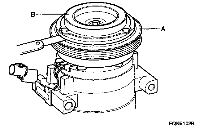 3. Measure the clearance between the pulley(A) and the pressure plate(B) all the way around. If the clearance is not within specified limits, remove the pressure plate and add or remove shims as needed to increase or decrease clearance.
