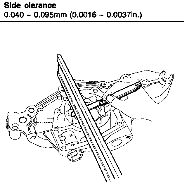 3. Inspect rotor side clearance. Using a feeler gauge and precision straight edge, measure the clearance between the rotors and precision straight edge.