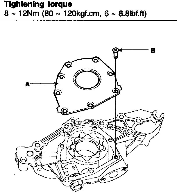 2) Install the oil pump cover (A) to front case with the 8 screws (B).