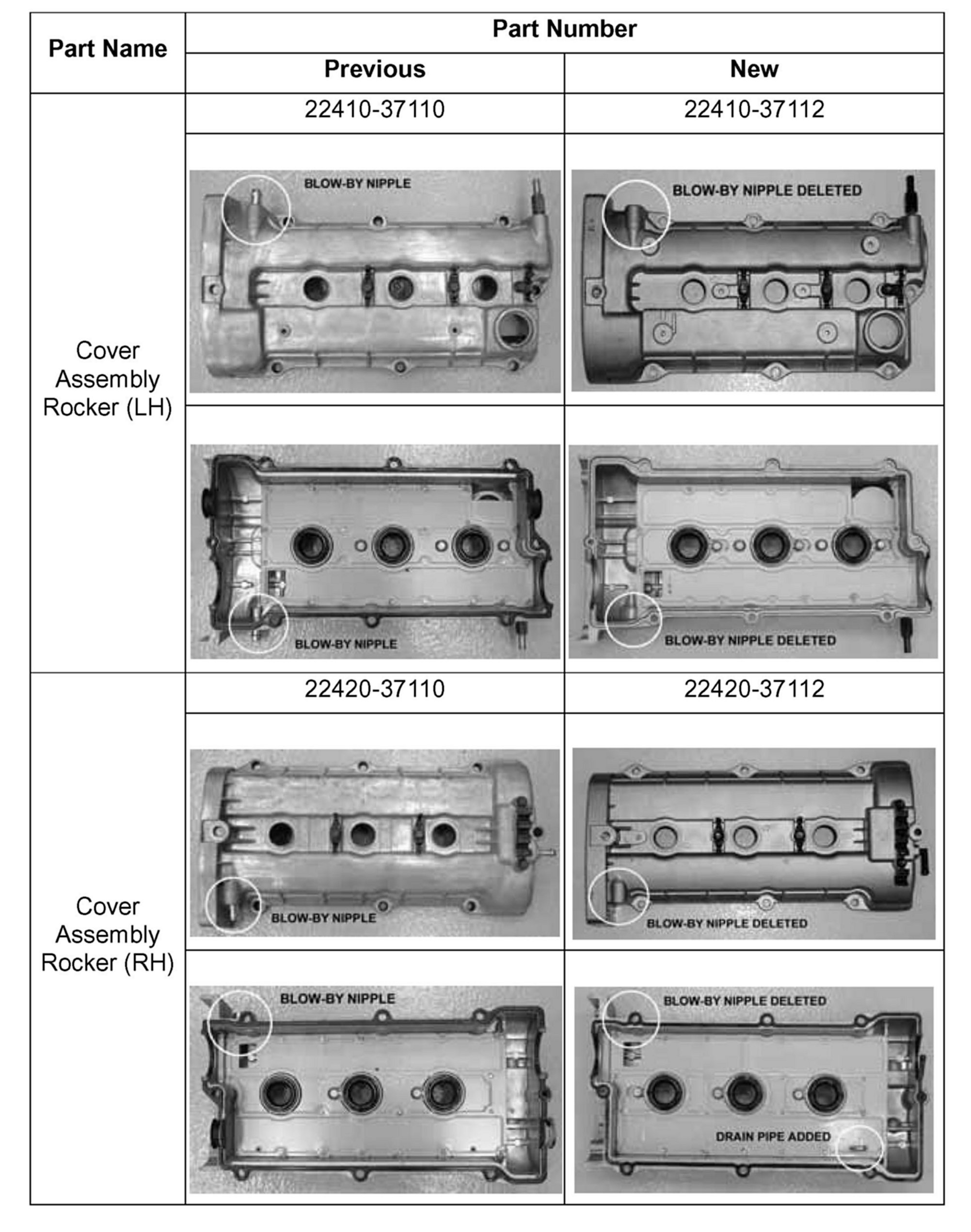 The rocker cover ventilation system has been changed on all 2.7L V6 engines. The blow-by nipple and hose has been deleted from both rocker covers. Small plates have been added to the breather plate on the LH (Bank 2) rocker cover assembly and a drain pipe has been added on the RH (Bank 1) rocker cover assembly.