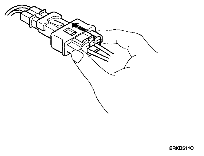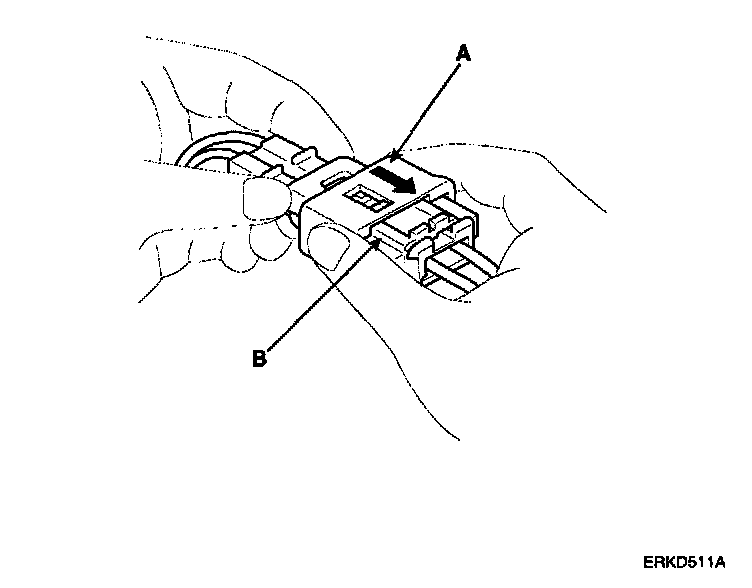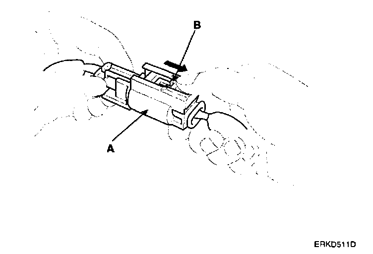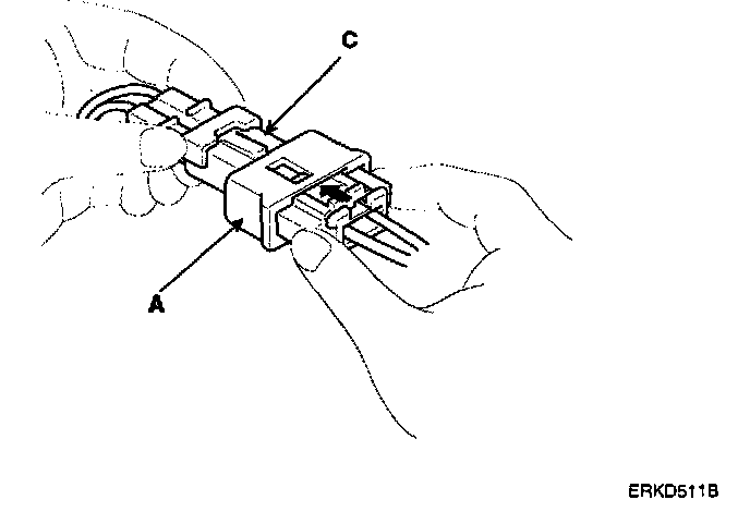 1. To reconnect, hold the pawl-side connector half, and press on the back of the sleeve-side connector half in the direction shown. As the two connector halves are pressed together, the sleeve (A) is pushed back by the pawl (C). Do not touch the sleeve.