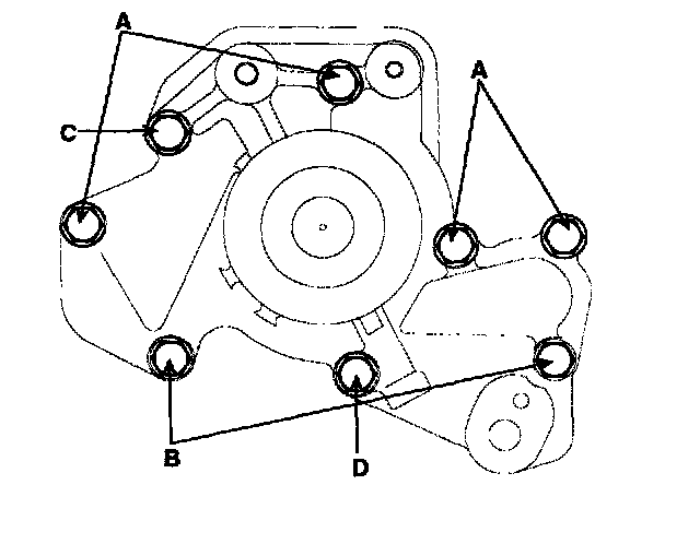 Install the water pump (A) and a new gasket (B) with the 8 bolts.