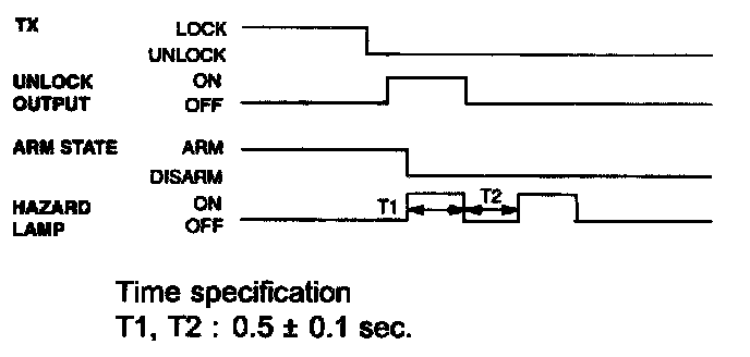 - Pressing the unlock button on the transmitter(TX) key. The hazard lamps shall be flashed twice for 1 sec period (of cycle), 50% duty rate.