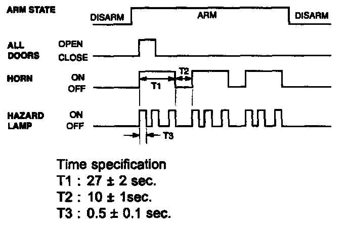 This system enters the armed state if it is in the prearmed state and,after 0.6 sec, check actuator lock and each door, hood and tailgate close,and no door warning switch (no key in ignition).