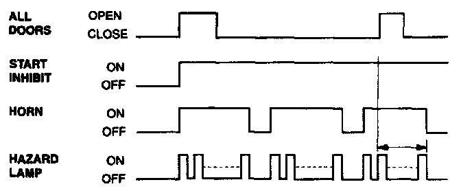- Audible (horn) and visual (hazard lamp) warnings are issued, for three cycles, each cycle 27 ± 2 sec. duration on, 10 ± 1 sec. off. The horn warning is continuously occurring during the on period. The hazard lamps operate with 1 sec period, 50% duty rate during the on period.