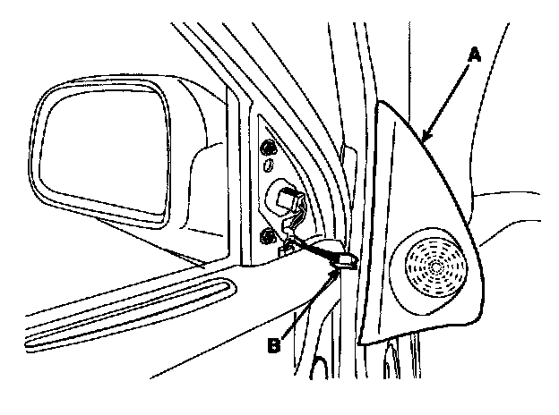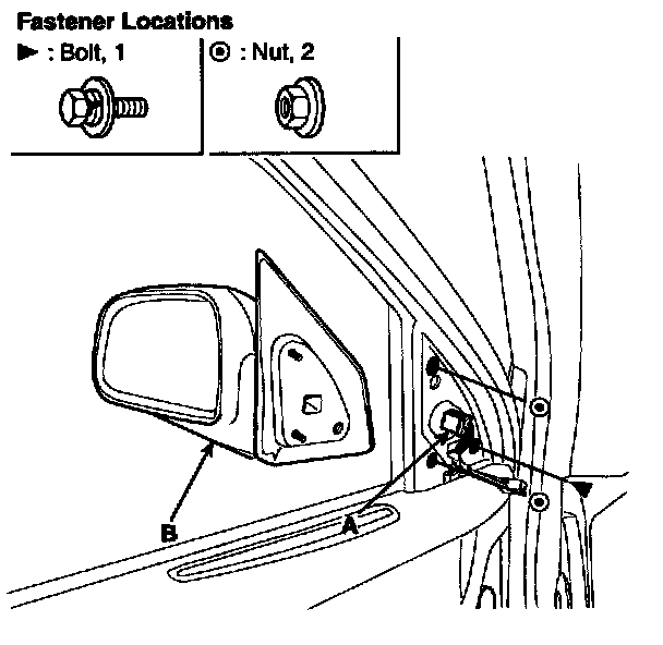 2. After disconnecting the connector (A), remove the outside rear view mirror (B).