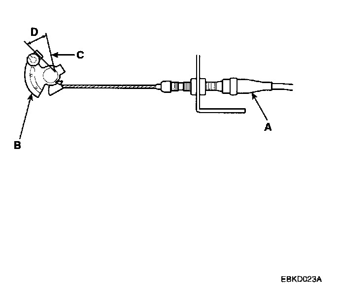 3. Measure the amount of movement of the output linkage (B) until the engine speed starts to increase. At first, the output linkage should be located at the fully closed position (C). The free play (D) should be 3.75 ± 0.5mm (0.15 ± 0.02 in.)