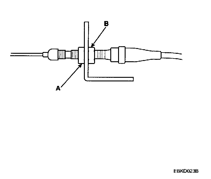 4. If the free play is not within specs, move the cable to the point where the engine speed starts to increase, and tighten the locknut (A) and adjusting nut (B).