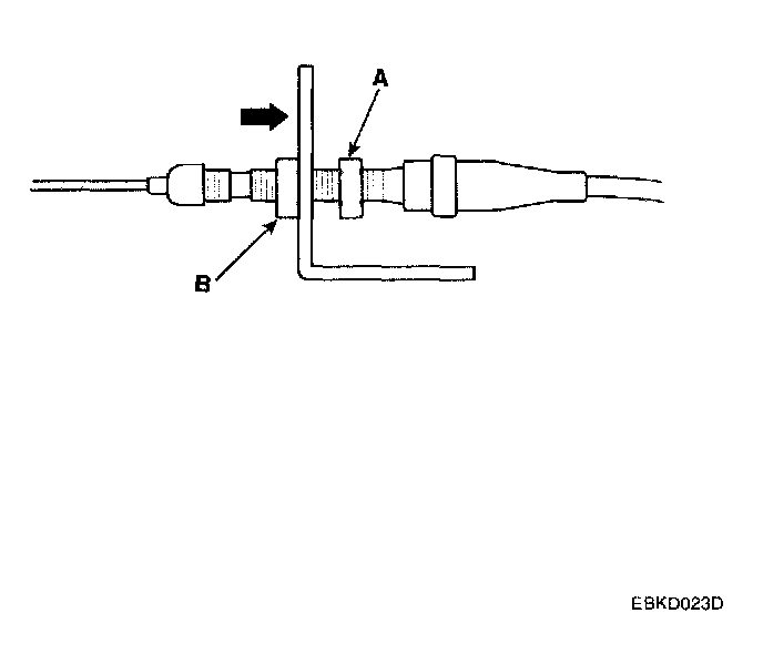 6. Pull the cable so that the adjusting nut (A) touches the bracket, and tighten the locknut (B).