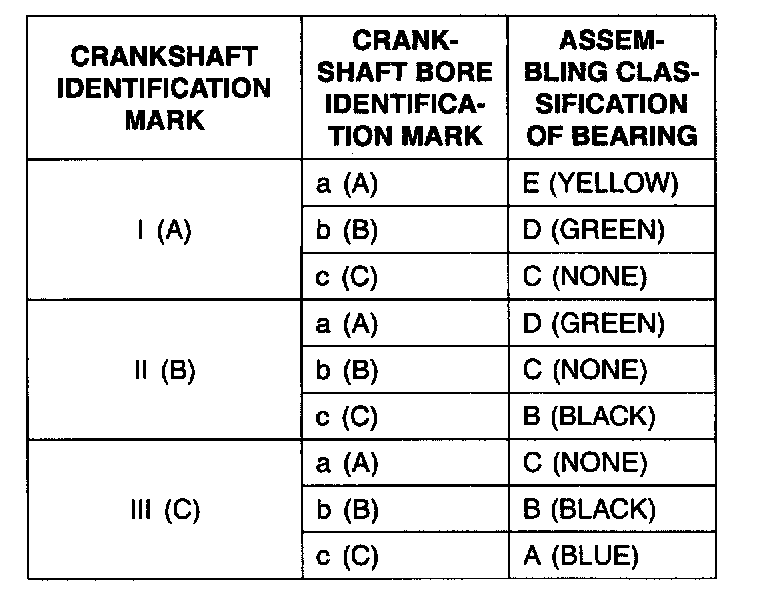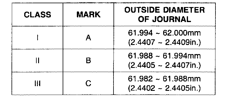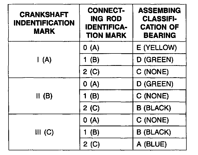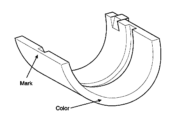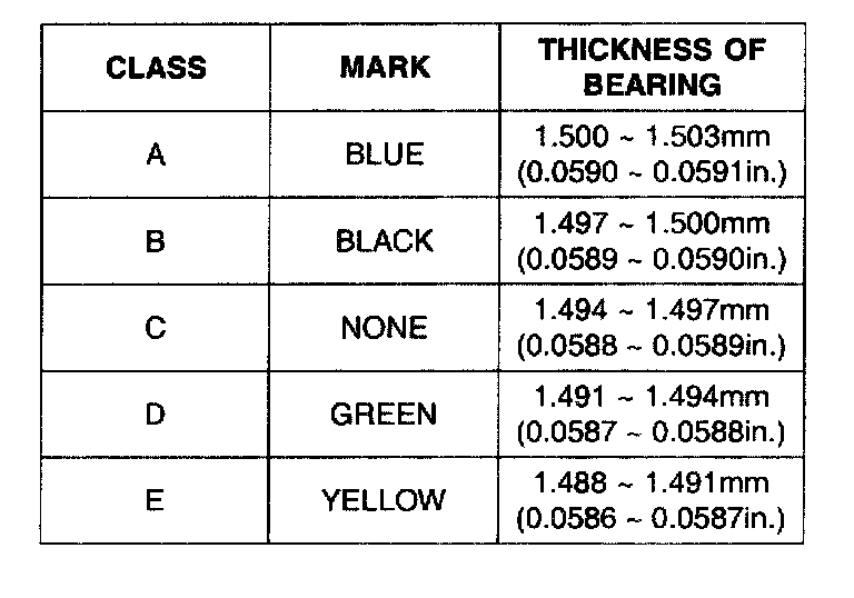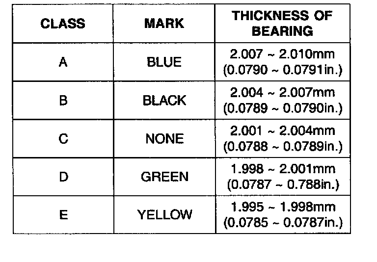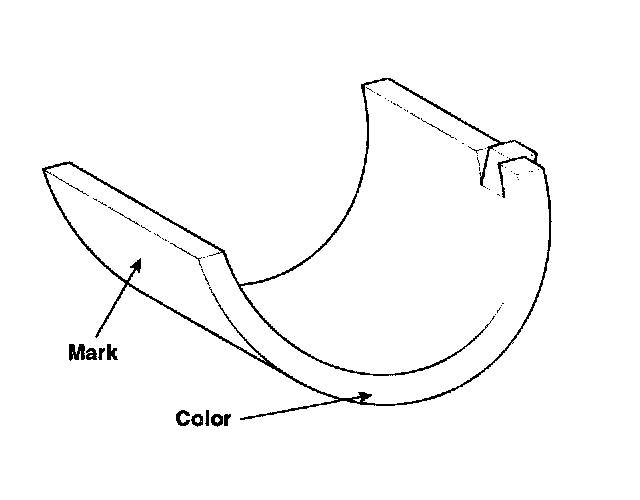 6) If the plastigage measures too wide or too narrow, remove the upper half of the bearing, install a new, complete bearing with the same color mark (select the color as shown in the next column), and recheck the clearance.
