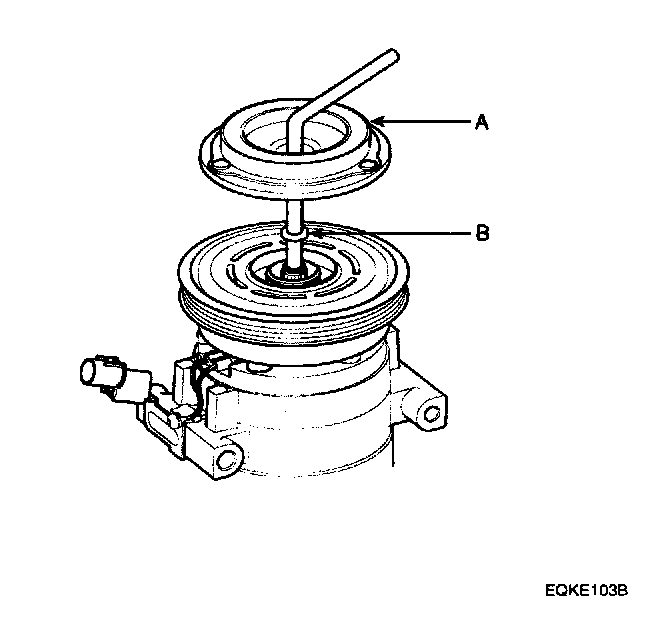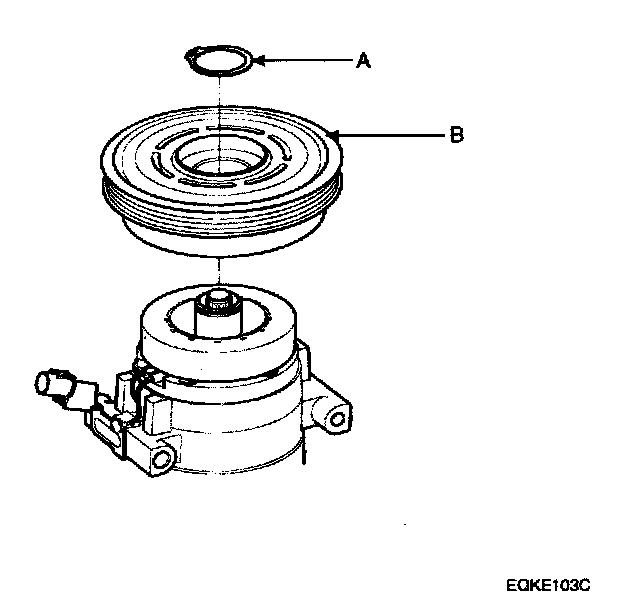 - Be careful not to damage the pulley (B) and compressor during removal/installation.
