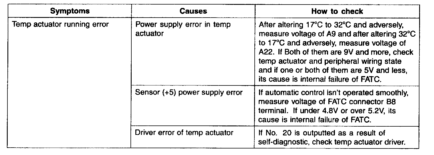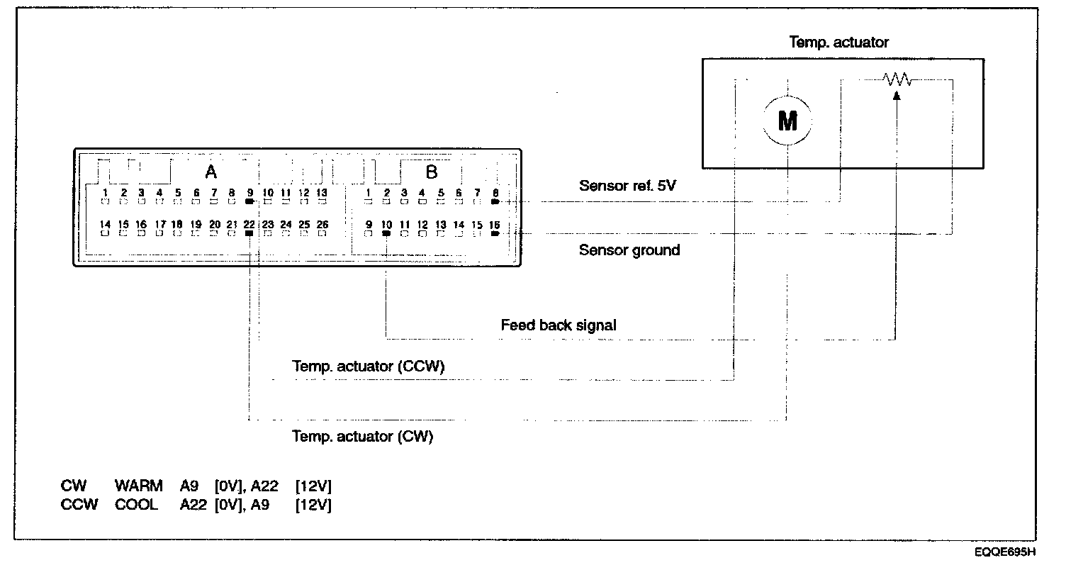 TEMP CHECKIn adjusting temp switch from 32 °C to 17 °C, 0 V is outputted from FATC connector A22 terminal, 12 V is supplied for A9 terminal and temp motor works in direction of COOL. In adjusting temp switch from 17 °C to 32 °C, 0 V is outputted from FATC connector A9 terminal, 12 V is supplied for A22 terminal and temp motor works in direction of WARM. When temp actuator has to move to a certain location for its automatic control, temp feedback signal terminal moves equally in temp actuator and informs controller of location of temp actuator through FATC connector B10 terminal. Comparing original value with inputted value, it works until they are same. If 4.9 V and more is inputted in B10 terminal, it is regarded as disconnection. If 0.1 V and less is inputted in B10 terminal, it is regarded as short-circuit. In the case of disconnection or short-circuit as a result of self-diagnostic, substitute control is carried out as follows.