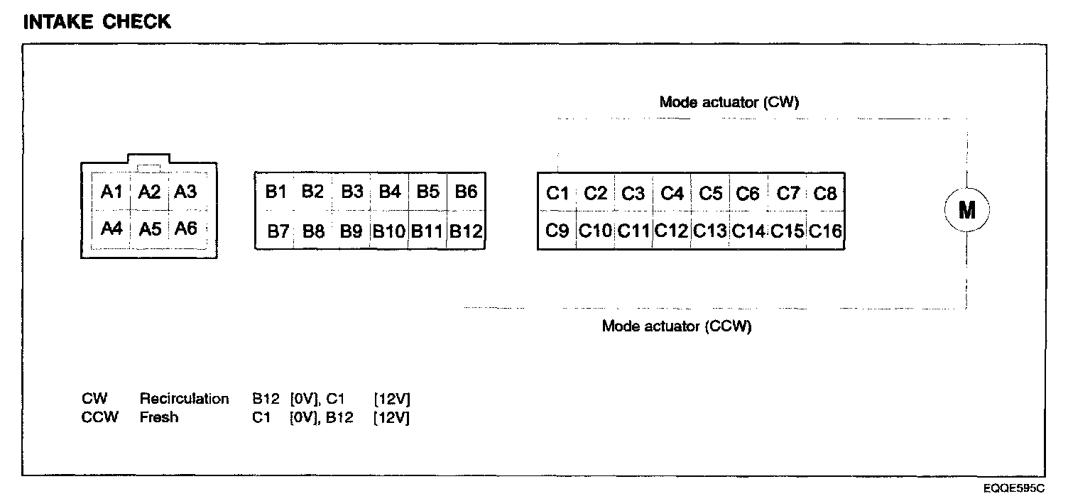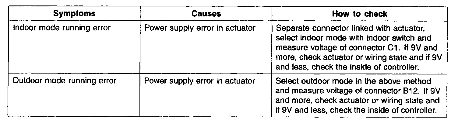 INTAKE CHECKIn turning on IG and selecting indoor mode with indoor switch, 0 V is outputted from connector B12, 12 V is supplied for C1 and motor works in direction of indoor. In selecting outdoor mode with indoor switch, 0 V is outputted from connector C1, 12 V is supplied for B12 and motor works in direction of outdoor.