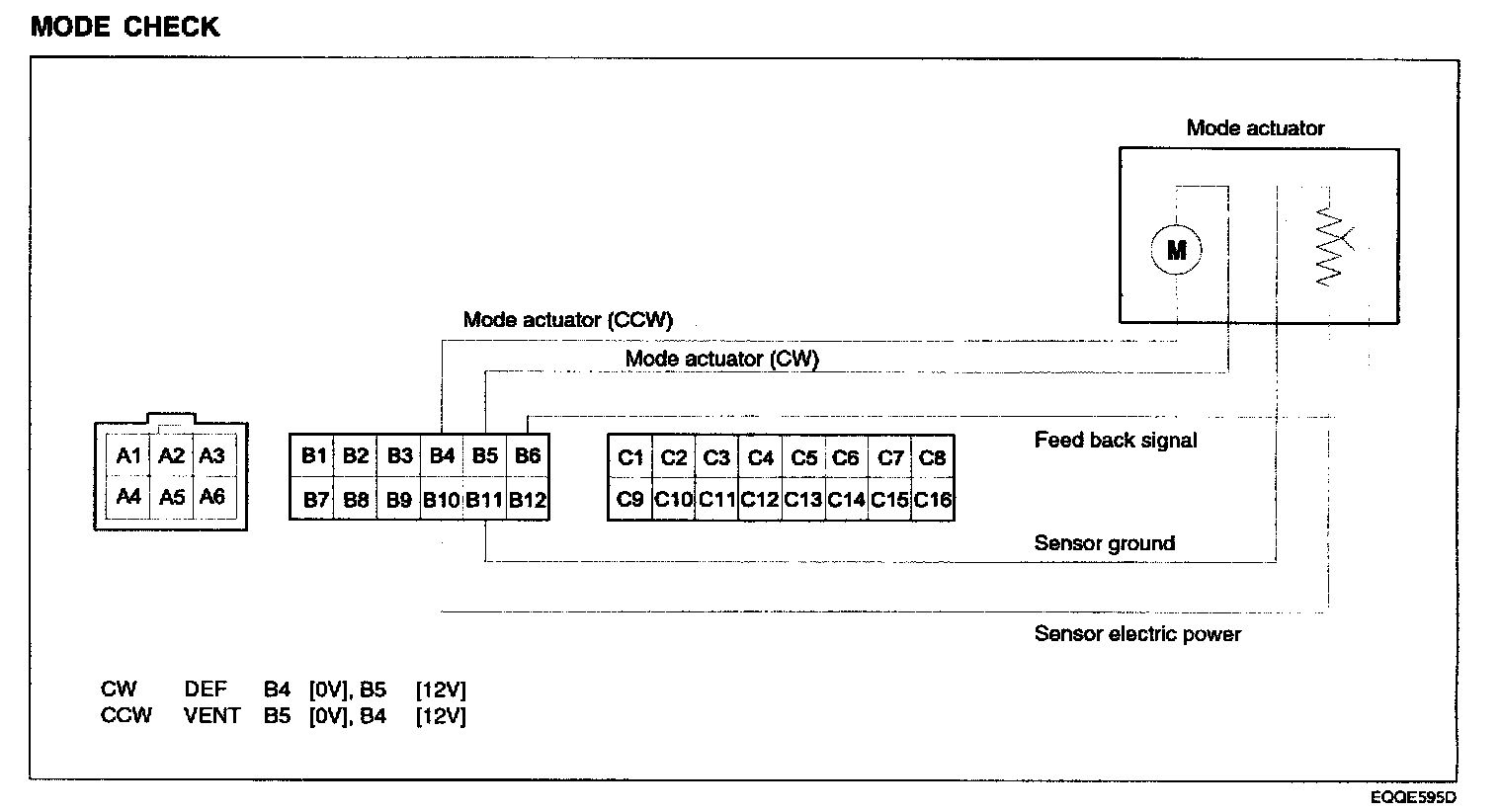 MODE CHECKAs shown in figure, in adjusting mode switch from VENT to DEF, 0 V is outputted from connector B4, 12 V is supplied for B5 and mode motor works in direction of DEF. In adjusting mode switch from DEF to VENT, 0 V is outputted from connector B5, 12 V is supplied for B4 and mode motor works in direction of VENT. When mode actuator has to move to a certain location for its automatic control, mode feedback signal terminal moves equally in mode actuator and informs controller of location of mode actuator through mode connector B6. Comparing original value with the inputted value, it works until they are same.