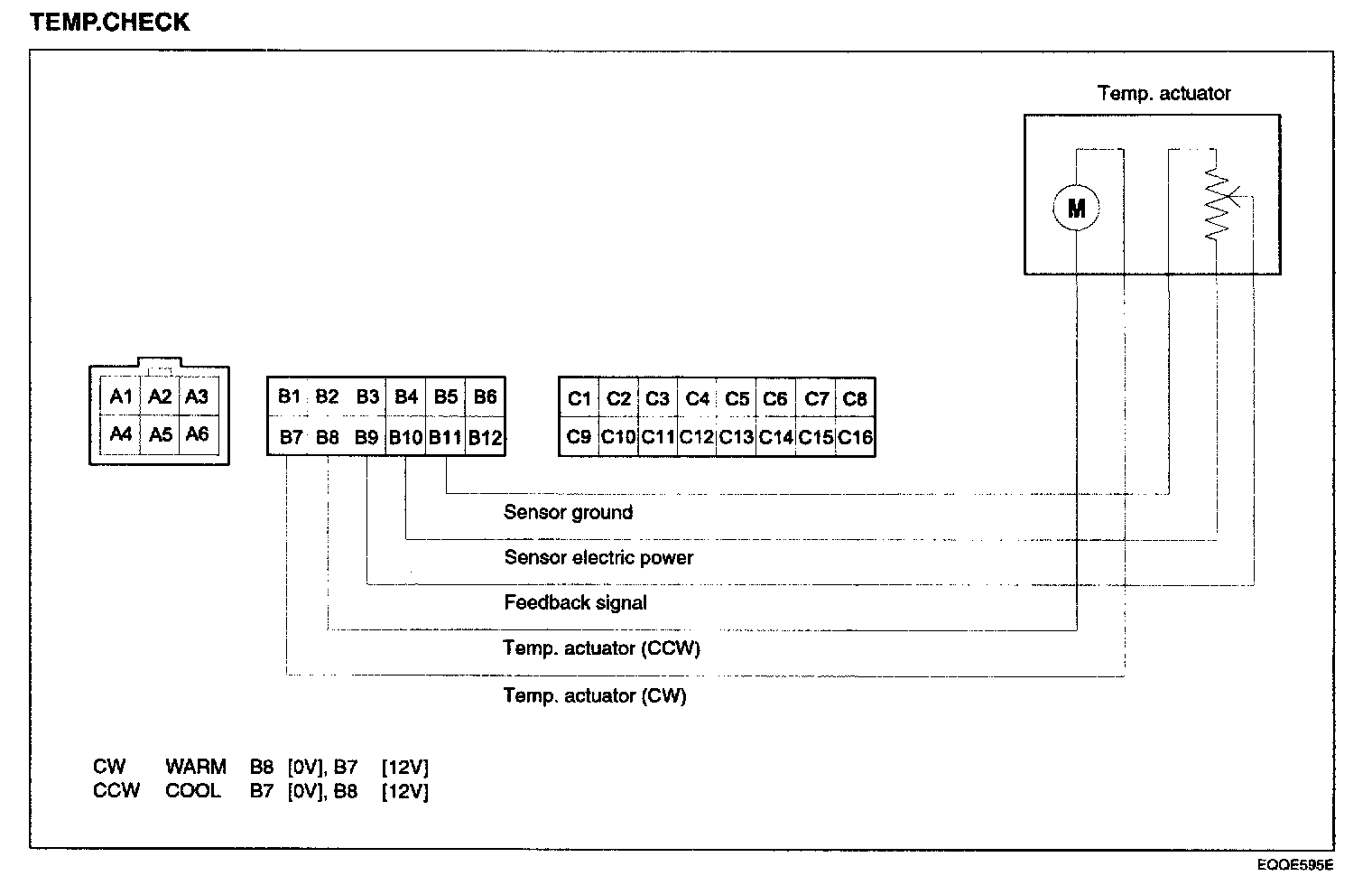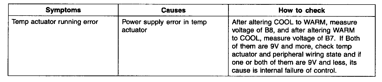 TEMP.CHECKAs shown in the figure, in adjusting temp. switch from WARM to COOL, 0 V is outputted from temp. connector B7, 12 V is supplied for B8 and temp. motor works in direction of COOL. In adjusting temp. switch from COOL to WARM, 0 V is outputted from temp. connector B8, 12 V is supplied for B7 and temp. motor works in direction of WARM. When temp. actuator has to move to a certain location for its automatic control, temp. feedback signal terminal moves equally in temp. actuator and informs controller of location of temp. actuator through temp. connector B9. Comparing original value with the inputted value, it works until they are same.