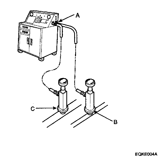 1. Connect a R-134a refrigerant recovery/recycling/charging station (A) to the high-pressure service port (B) and the low-pressure service port (C), as shown, following the equipment manufacturer's instruction.
