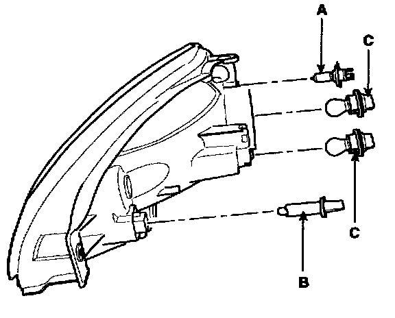 3. Replace the head lamp bulb(A), position bulb(B) and turn signal bulbs(C).