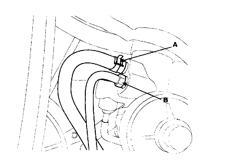 6. Fix the return hose (A) and pressure tube (B) fitting to the power steering gear box.