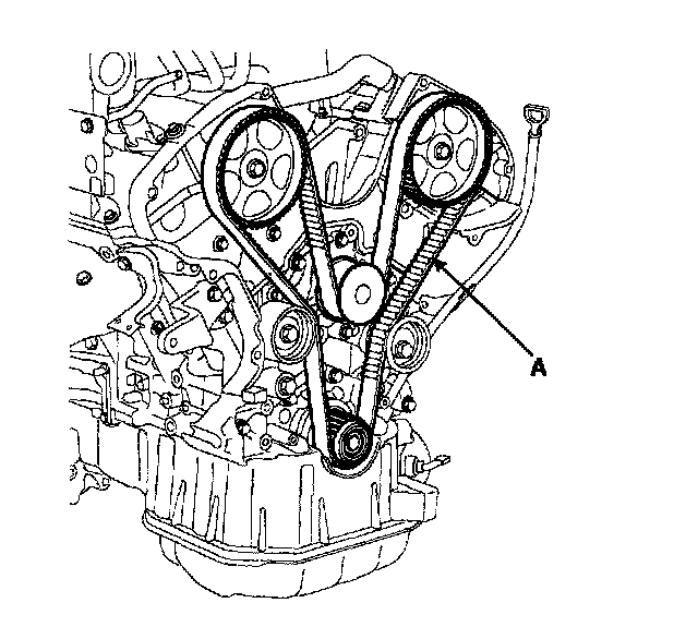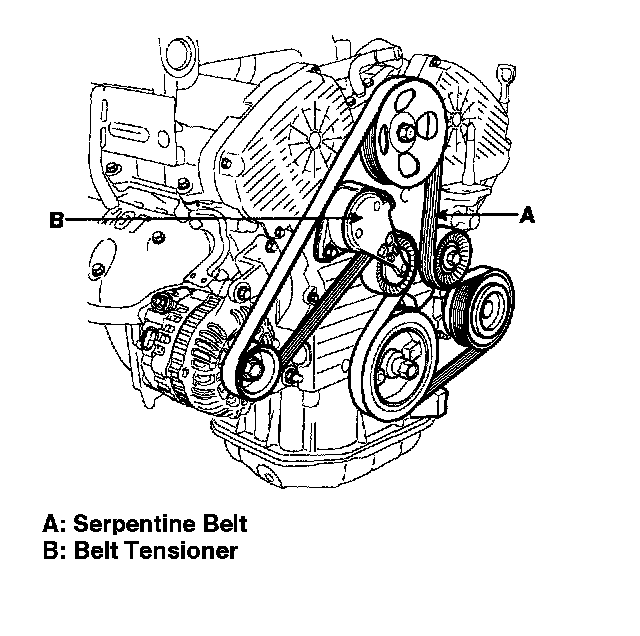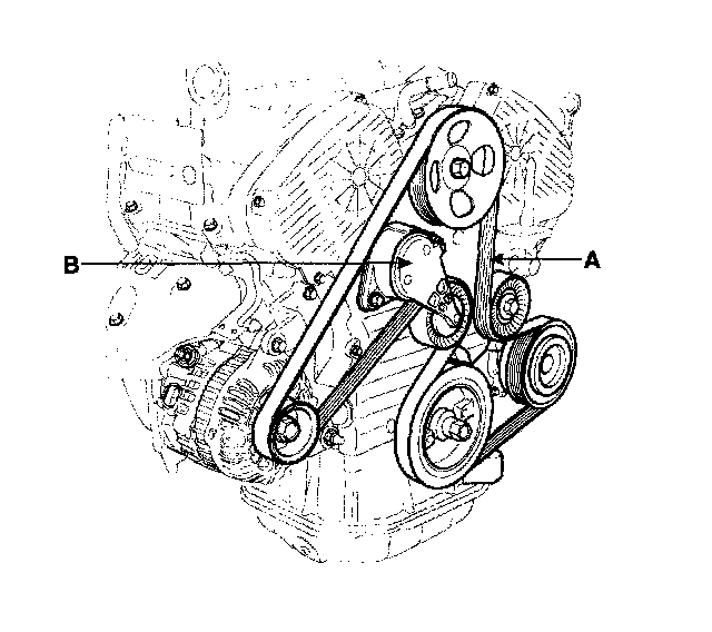 16. Install the drive belt tensioner (B) and drive belt (A).