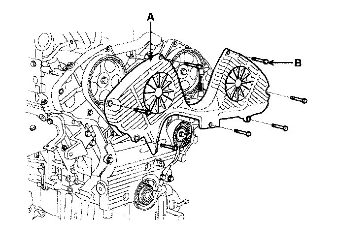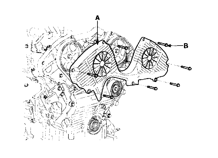 8. Remove the 7 bolts(B) and timing belt upper cover (A).