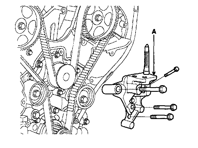 Alternately loosen the 2 bolts, and remove the tensioner (A).