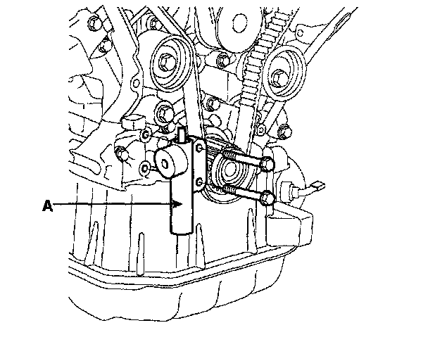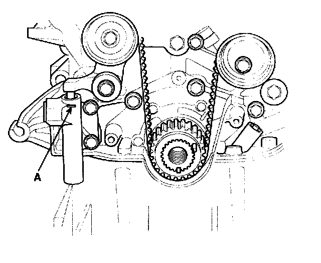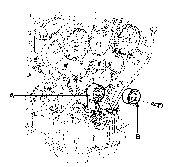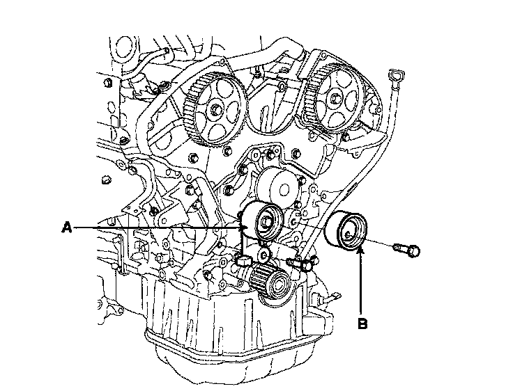 16. Remove the tensioner pulley (A) and timing belt idler pulley (B).