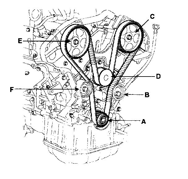 2) Install the timing belt in this order. Crankshaft sprocket (A) -> Idler pulley (B) Camshaft sprocket LH side (C) -> Water pump pulley (D) -> Camshaft sprocket RH side (E) Tensioner pulley (F).