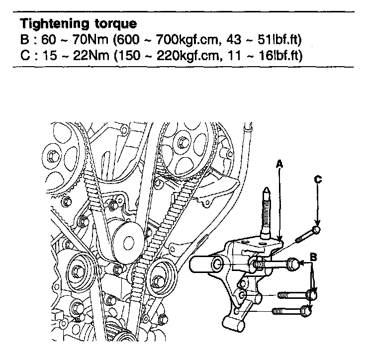 Tensioner arm fixed bolt 35 - 55Nm (350 - 550kgf-cm, 25 - 40 ft. lbs.)