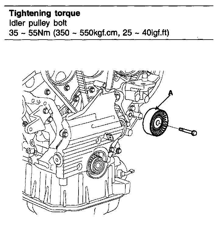 Idler pulley bolt 35 - 55 Nm (350 - 550 kgf-cm, 25 - 40 ft. lbs.)