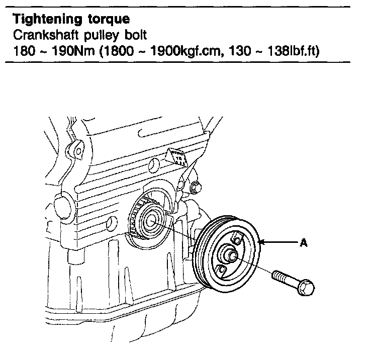 Crankshaft pulley bolt 180 - 190 Nm (1800 - 1900 kgf-cm, 130 - 138 ft. lbs.)