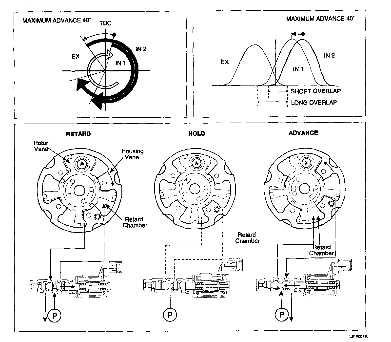 If a malfunction occurs, the CVVT system control is disabled and the valve timing is fixed at the fully retarded p0sition.