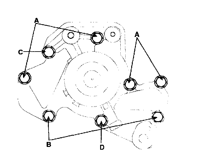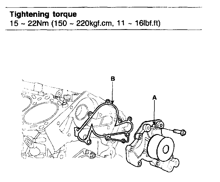 Install the water pump (A) and a new gasket (B) with the 8 bolts.