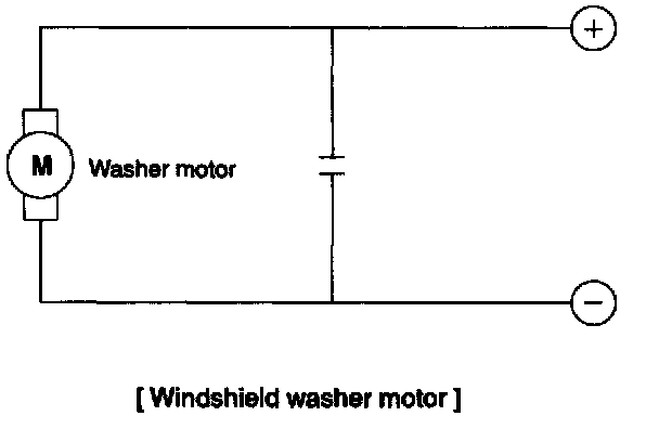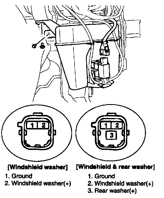 2. Connect positive (+) and negative (-) battery cables to terminals 2 and 1 respectively to see that the washer motor runs and water sprays from the front nozzles.