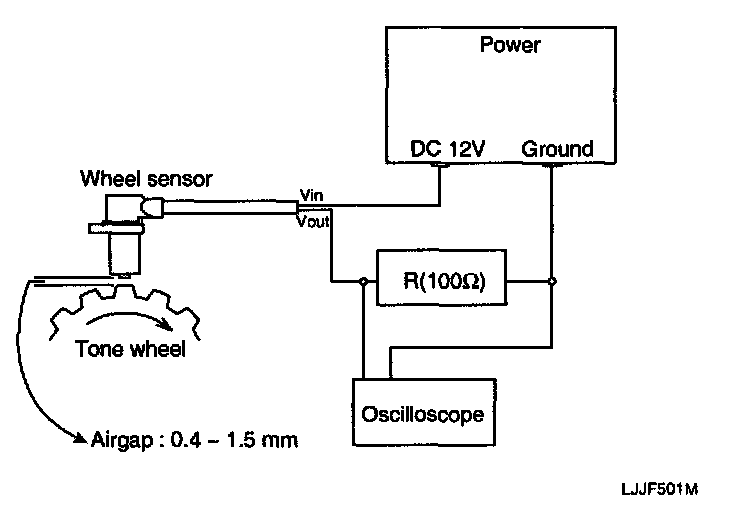 2. Compare the change of the output voltage of the wheel speed sensor to the normal change of the output voltage as shown below.