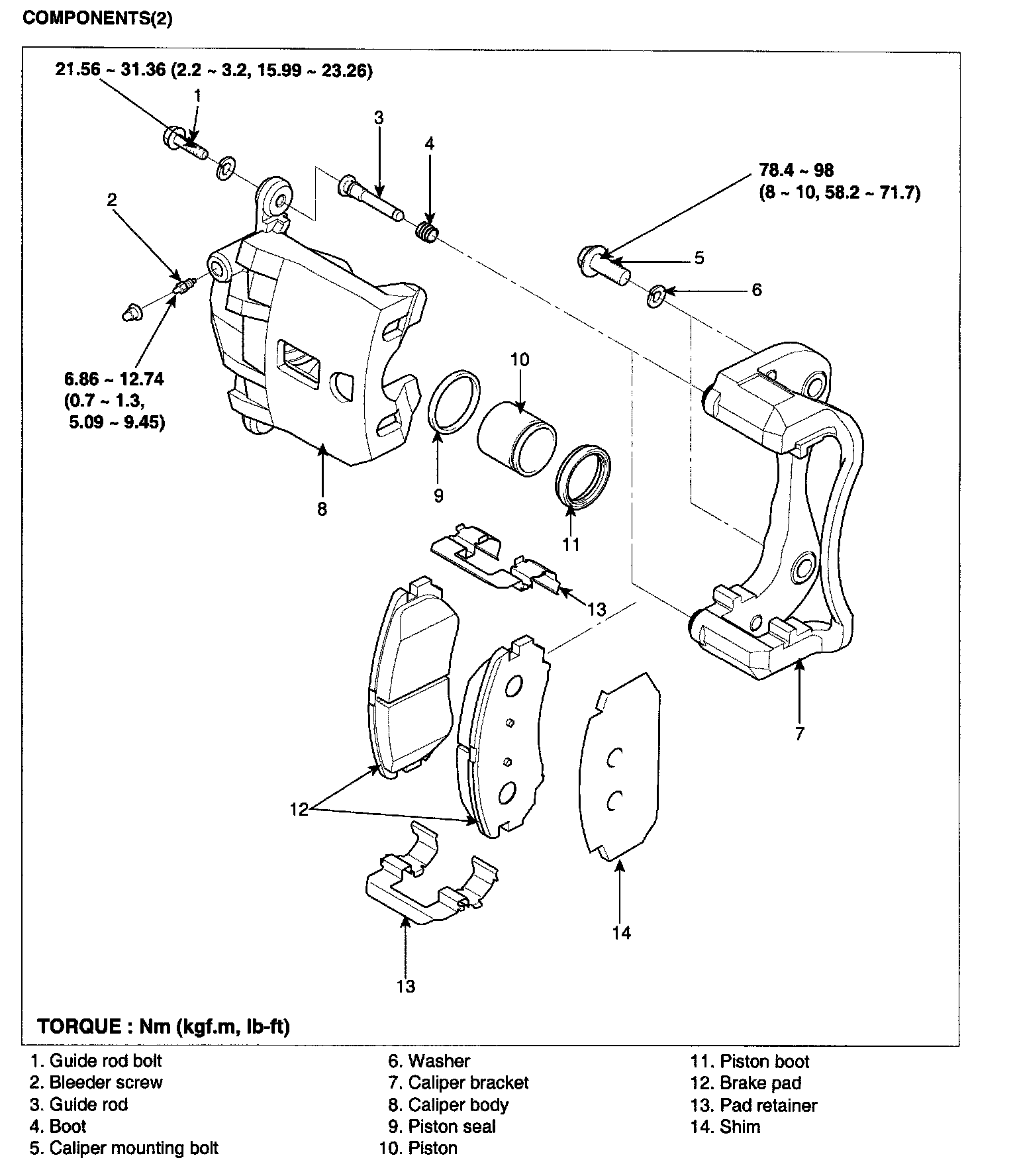 2. Check that grease is applied to sliding contact points and if there is damage to the pad and backing metal.