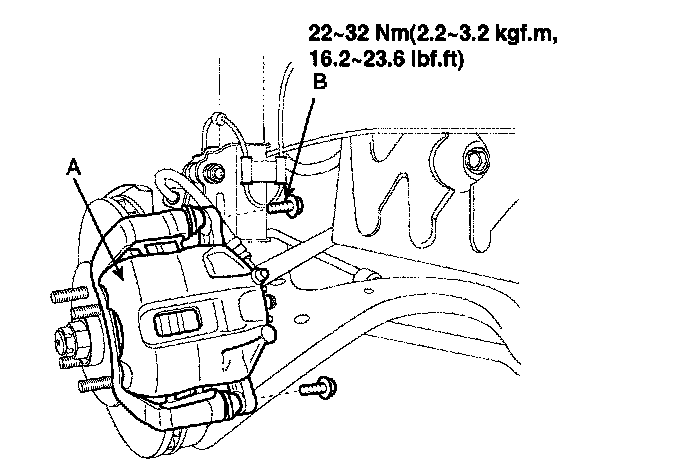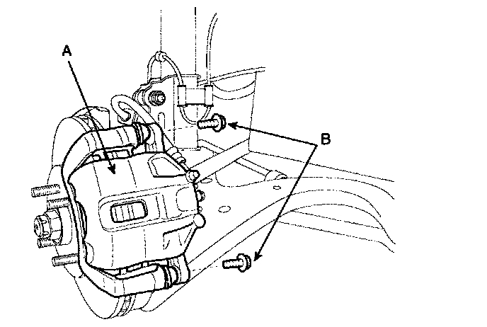 1. Remove guide rod bolt(B) and raise the caliper (A).Check the hoses and pin boots for damage and deterioration.