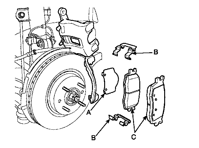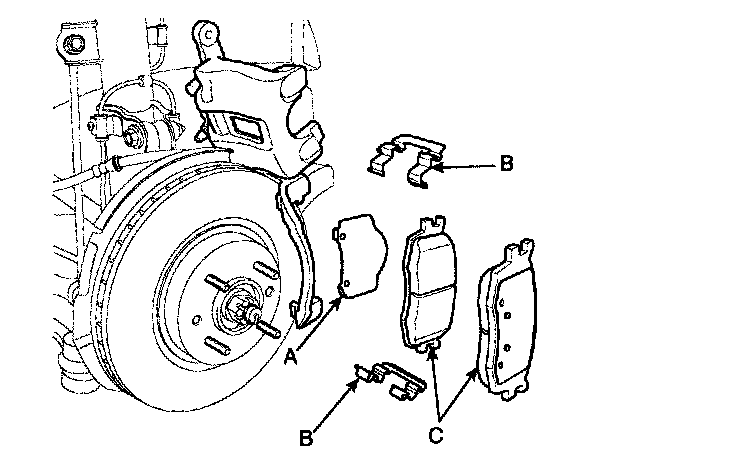 3. Install the brake pads (C) and pad shims (A) on the pad retainer correctly. Install the pad with the wear indicator on the inside. If you are reusing the pads, always reinstall the brake pads in their original positions to prevent a momentary loss of braking efficiency.