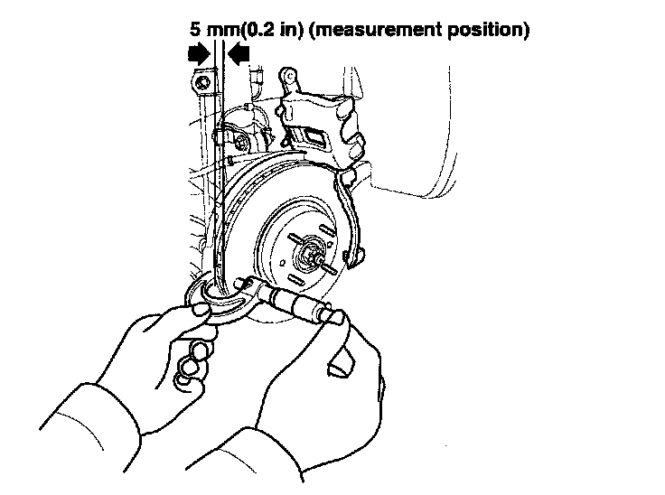 1. Place a dial gauge about 5mm (0.2 in) from the outer circumference of the brake disc, and measure the run out of the disc.