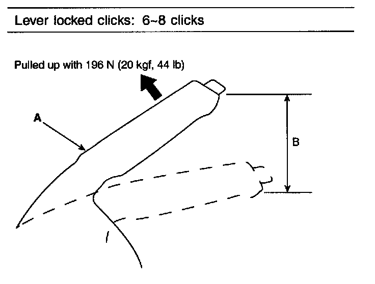 1. Pull the parking brake lever (A) with 196 N (20 kg, 44lbf) force to fully apply the parking brake. The parking brake lever should be locked within the specified number of clicks (B).