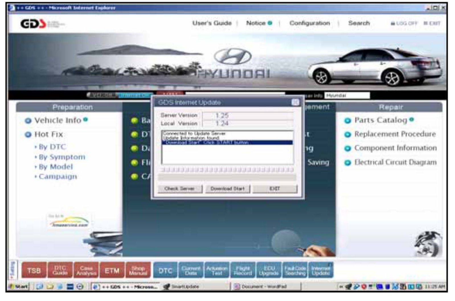 Touch the Internet Update to check that your GDS has Local Version 1.25 or higher. Here's an example of an Internet Update available to Server Version 1.25 with the current GDS Local Version at 1.24 so the Download Start button is available to conduct the internet update:
