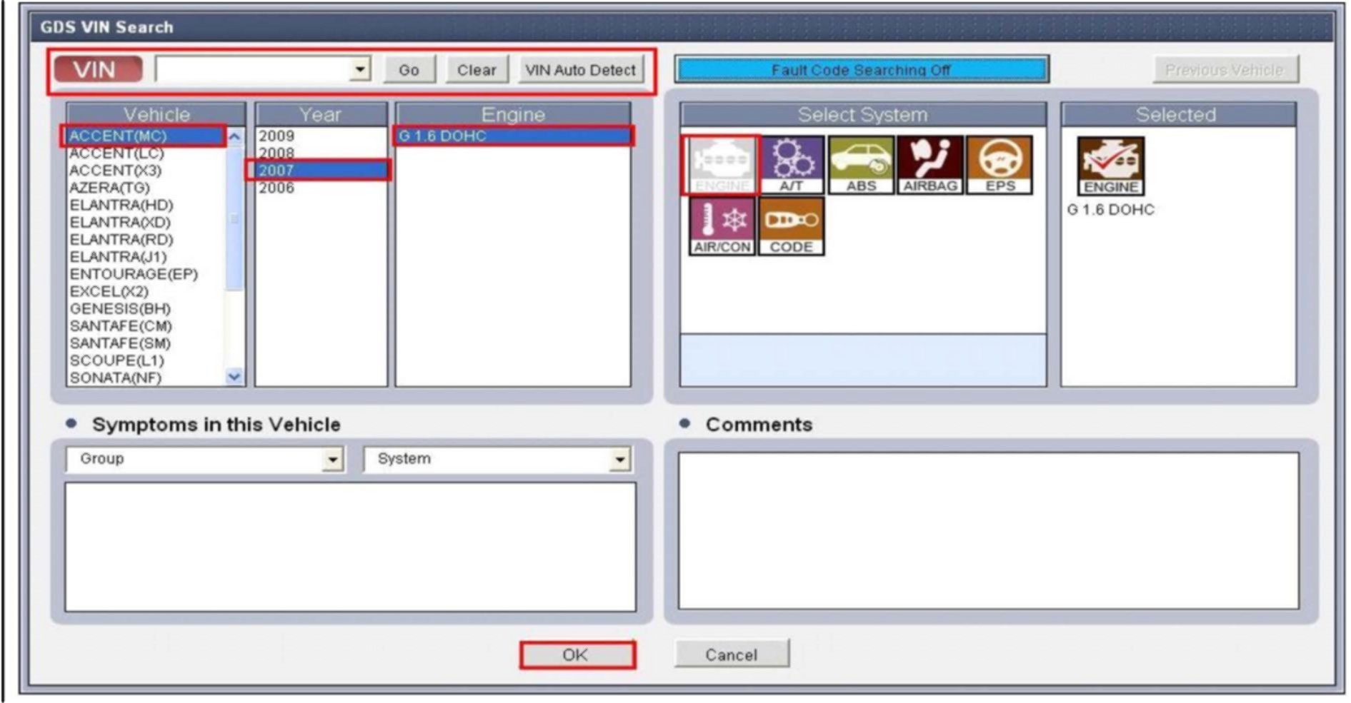 2. Enter the vehicle information by pressing the VIN Auto Detect button, entering the vehicle's VIN or selecting the vehicle model, model year, engine/fuel type and ENGINE as the system and then click OK.
